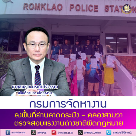 นายสมชาย มรกตศรีวรรณ อธิบดีกรมการจัดหางาน เปิดเผยว่า กรมการจัดหางานได้ดำเนินการตามข้อสั่งการของนายพิพัฒน์ รัชกิจประการ รัฐมนตรีว่าการกระทรวงแรงงาน ที่ให้ความสำคัญกับการคุ้มครองโอกาสการมีงานทำของคนไทย และการจัดระเบียบแรงงานต่างด้าวให้ถูกต้องตามกฎหมาย โดยได้มอบหมายให้เจ้าหน้าที่ชุดปฏิบัติการตรวจสอบการทำงานของแรงงานต่างชาติ กรมการจัดหางาน ลงพื้นที่ตรวจสอบสถานประกอบการอย่างต่อเนื่อง ภายใต้ปฏิบัติการ “เจอ จับ ปรับ ผลักดัน” เพื่อไม่ให้แรงงานต่างชาติแย่งอาชีพคนไทย และยกระดับมาตรฐานการจ้างงานให้เป็นธรรม