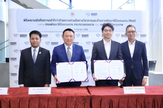 วันที่ 5 มิถุนายน 2568 นายเดชา พฤกษ์พัฒนรักษ์ อธิบดีกรมพัฒนาฝีมือแรงงาน และนายภูรัตน์ โอสถานุเคราะห์ ตำแหน่งอธิการบดีมหาวิทยาลัยกรุงเทพ ร่วมลงนามบันทึกข้อตกลงความร่วมมือทางวิชาการและด้านการพัฒนาฝีมือแรงงาน มีนายภัทรวุธ เภอแสละ รองอธิบดีกรมพัฒนาฝีมือแรงงาน และผู้ช่วยศาสตราจารย์สรรเสริญ มิลินทสูต รองอธิการบดีอาวุโสด้านวิชาการลงนามเป็นพยาน ณ ห้อง The Lobby (อาคาร Tourism Tower ชั้น 2) มหาวิทยาลัยกรุงเทพ