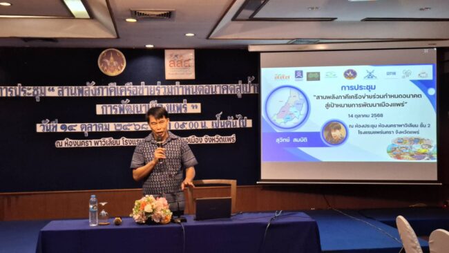 วันอังคารที่ 14 ตุลาคม 2568 เวลา 08.30 น. สมาคมภาคีพัฒนาจังหวัดแพร่ จัดประชุมสานพลังภาคีเครือข่ายร่วมกำหนดอนาคตสู่เป้าหมายการพัฒนาเมืองแพร่ เพื่อยกระดับกลไกและกระบวนการจัดทำนโยบายสาธารณะ การพัฒนาความร่วมมือให้มีการดำเนินการเป็นระบบ และขยายเครือข่ายการทำงานกับภาคีหน่วยงานต่าง ๆ เพื่อสร้างการรับรู้ในระดับจังหวัดร่วมกัน และสนับสนุนการขับเคลื่อนประเด็นนโยบายสาธารณะและแผนพัฒนาที่เป็นประเด็นร่วมของจังหวัดแพร่ โดยมีผู้รับผิดชอบจัดทำแผนพัฒนาจังหวัดแพร่เข้าร่วมเสนอข้อมูล จัดทำและเสนอประเด็นแผนยุทธศาสตร์