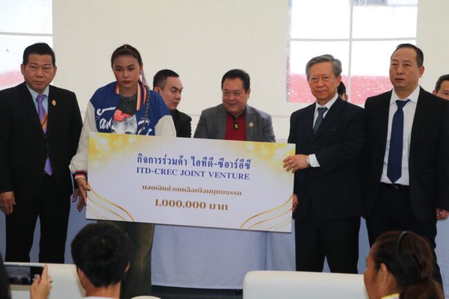 พันตำรวจเอก ทวี สอดส่อง รัฐมนตรีว่าการกระทรวงยุติธรรม นำ สภาทนายความฯ, กรมคุ้มครองสิทธิและเสรีภาพ, กิจการร่วมค้า ระหว่าง บริษัท อิตาเลียนไทย ดีเวล๊อปเมนต์ จํากัด (มหาชน) และบริษัท ไชน่า เรลเวย์ นัมเบอร์ 10 (ประเทศไทย) จํากัด แถลงข่าวต่อสื่อมวลชน มอบเช็ค ให้ทายาทผู้เสียชีวิต จากเหตุ อาคารสำนักงานแห่งใหม่ของสำนักงานตรวจเงินแผ่นดิน (สตง.) ที่กำลังก่อสร้างถล่ม เพิ่มเติมอีก 40 ราย จำนวน 40 ล้านบาท