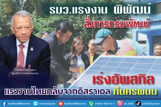กรมพัฒนาฝีมือแรงงาน รับข้อสั่งการ รมว. แรงงาน พิพัฒน์ อัพสกิลแรงงานกลับจากอิสราเอล ประเดิมลงพื้นที่นครพนม เยี่ยมชมการฝึกการติดตั้งโซล่าเซลล์เพื่อประยุกต์ใช้ในภาคการเกษตร