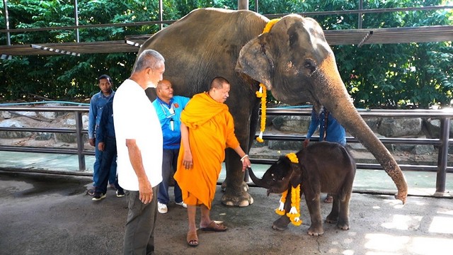 สวนนงนุชพัทยา จึงได้จัดขบวนนางรำและโขลงช้าง จำนวน 50 เชือก พร้อมพวงมาลัยและสายสิญจน์ โดยมีพระครูเกษมกิตติโสภณ เจ้าอาวาสวัดสามัคคีบรรพต เป็นประธานฝ่ายสงฆ์ดำเนินพิธีคล้องพวงมาลัยและสายสิญจน์ลงแป้งเจิมหน้าผากแม่ช้างและลูกช้างเพื่อความเป็นศิริมงคลแก่แม่และลูกช้าง พร้อมกันนี้ ท่านประสวนนงนุชพัทยาตั้งชื่อให้น้องช้าง ชื่อพังนพมาศ
