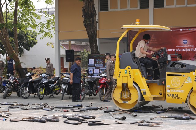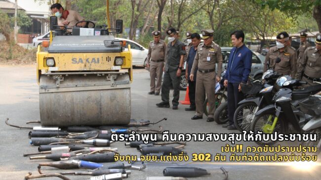 โดยสามารถตรวจยึดของกลางรถจักรยานยนต์ดัดแปลงสภาพ ท่อรถเสียงดังเกินกฎหมายกำหนดจากการกระทำความผิด ตั้งแต่วันที่ 1 ม.ค. – 13 มี.ค. 67 รวมจำนวน 302 ราย โดยได้รับความร่วมมือจากเพจฮาลำพูน และพี่น้องประชาชนแจ้งเบาะแสจากช่องทางต่างๆ นำไปสู่การจับกุม จำนวน 43 ราย นอกจากนี้ ยังมีการถอดอุปกรณ์ส่วนควบที่ผิดกฎหมายจากรถจักรยานยนต์ที่มีการตรวจยึดไว้ประเภท ท่อไอเสีย และอุปกรณ์แต่งซิ่ง จึงได้ดำเนินการทำลายทิ้งด้วยการใช้รถบดเหยียบทำลายต่อหน้าสื่อมวลชน เพื่อมิให้มีการนำกลับไปใช้กระทำความผิดกฎหมายได้อีก