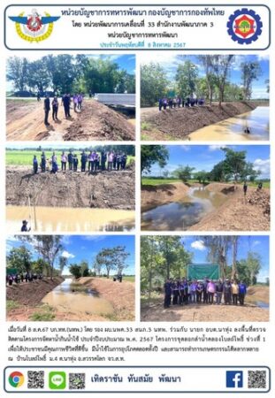 เมื่อวันที่ 8 ส.ค.67 บก.ทท.(นทพ.) โดย นพค.33 สนภ.3 นทพ. รองผู้บังคับหน่วยพัฒนาการเคลื่อนที่ 33 สำนักงานพัฒนาภาค 3 หน่วยบัญชาการทหารพัฒนา ร่วมกับ นายก องค์การบริหารส่วนตำบลนาทุ่ง อำเภอสวรรคโลกจังหวัดสุโขทัย ลงพื้นที่ตรวจติดตามโครงการจัดหาน้ำกินน้ำใช้ ประจำปีงบประมาณ พ.ศ. 2567 โครงการขุดลอกลำน้ำคลองโบสถ์โพธิ์ ช่วงที่ 1 เพื่อให้ประชาชนมีคุณภาพชีวิตที่ดีขึ้น มีน้ำใช้ในการอุปโภคตลอดทั้งปี และสามารถทำการเกษตรกรรมได้หลากหลาย โดยมี นางสาว มินตราภรณ์พุ่มชบา นายกองค์การบริหารส่วนตำบลนาทุ่งและคณะผู้บริหารร่วมให้การต้อนรับ