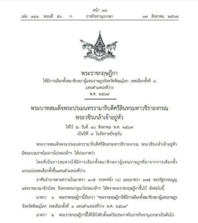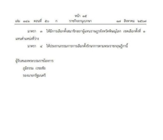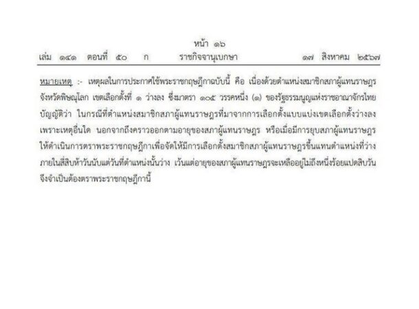 “ทั้งนี้ ต้องรอให้มีพระราชกฤษฎีกาให้การเลือกตั้งสมาชิกสภาผู้แทนราษฎร จังหวัดพิษณุโลก เขตเลือกตั้งที่ 1 แทนตำแหน่งที่ว่าง มีผลไข้บังคับ แผนการจัดการเลือกตั้ง ส.ส. พิษณุโลก เขต 1 แทนตำแหน่งที่ว่าง