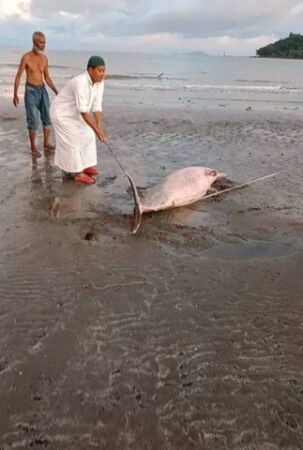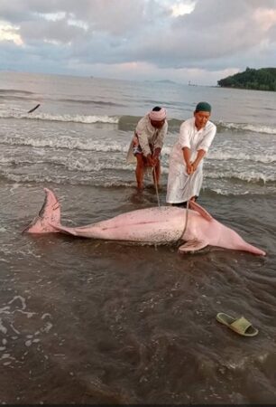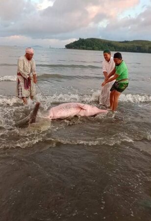 นาทีชีวิตน้องโลมาสีชมพู รอดหวุดหวิด หลังเกยหาดบ้านแหลมสน ตำบลแหลมสน อำเภอละงู จังหวัดสตูล ในช่วงเช้ามืดที่ผ่านมา (30 ก.ย.2567) หลังมีชาวบ้านออกมาหาหอยริมชายหาดในช่วงเช้ามืดกลับพบเห็นน้องโลมาสีชมพู มีขนาดตัวใหญ่ไม่น้อยกว่า 150 กิโลกรัม ลำตัวมีสีชมพู ที่คลีบมีบาดแผลเล็กน้อย นอนเกยหาดดังกล่าว หลังน้ำทะเลลดลงไปมากด้วยความตกใจจึงรีบวิ่งไปบอกชาวบ้านและผู้ช่วยผู้ใหญ่บ้านมาช่วยกันนำลงน้ำ ทันใดนั้นนายสมบัตร สันมาแอ ผู้ช่วยผู้ใหญ่บ้านบูโบย หมู่ที่ 3 ที่อยู่บริเวณนั้นพอดีจึงรีบเกณฑ์คน 4-5 คนไปช่วยนำน้องโลมาสีชมพูลงน้ำด้วยความที่กลัวมันจะตาย จึงหาเชือกบริเวณใกล้ ๆ ลากน้องโลมารีบลงน้ำทะเล หลังพบว่าน้ำในบริเวณนั้นลดมานานกว่า 3 ชั่วโมงแล้ว ด้วยกลัวว่าจะตายจึงรีบช่วยกัน ใช้เวลาประมาณ 20 นาทีก็ช่วยลงน้ำทะเลลึกที่พอจะว่ายกลับไปสู่ทะเลกว้างได้สำเร็จ