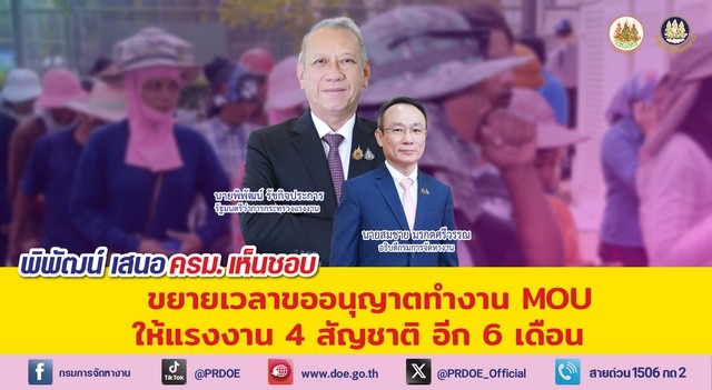 รมว. พิพัฒน์ เสนอ ครม. เห็นชอบ ขยายเวลาต่ออายุใบอนุญาตทำงานในลักษณะ MOU แรงงานกัมพูชา เมียนมา อีก 6 เดือน ถึง 13 ส.ค. 68 ลาว เวียดนาม 3 เดือน ถึง พ.ค. 68