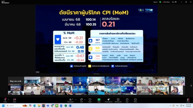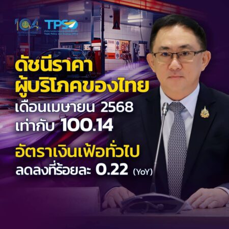 วันอังคารที่ 6 พฤษภาคม 2568 เวลา 10.00 น. นายพูนพงษ์ นัยนาภากรณ์ ผู้อำนวยการสำนักงานนโยบายและยุทธศาสตร์การค้า เป็นประธานในการแถลงดัชนีราคาผู้บริโภค ประจำเดือนเมษายน 2568 เผยว่า ดัชนีราคาผู้บริโภคของไทย เท่ากับ 100.14 อัตราเงินเฟ้อทั่วไปลดลงร้อยละ 0.22 (YoY)