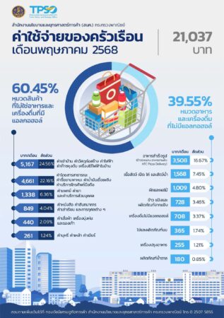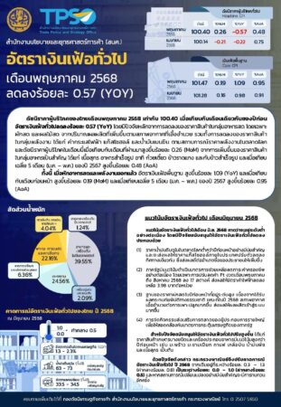 วันศุกร์ที่ 6 มิถุนายน 2568 เวลา 13.30 น. นายพูนพงษ์ นัยนาภากรณ์ ผู้อำนวยการสำนักงานนโยบายและยุทธศาสตร์การค้า (สนค.) โฆษกกระทรวงพาณิชย์ เผยว่า ดัชนีราคาผู้บริโภคทั่วไปของไทย เดือนพฤษภาคม 2568 เท่ากับ 100.40 เมื่อเทียบกับเดือนพฤษภาคม 2567 ซึ่งเท่ากับ 100.98 ทำให้อัตราเงินเฟ้อทั่วไปลดลงร้อยละ 0.57 (YoY) โดยปัจจัยหลักมาจากการลดลงของราคาสินค้าในกลุ่มอาหารสด โดยเฉพาะผักสด และผลไม้สด จากปริมาณผลผลิตที่เพิ่มขึ้นตามสภาพอากาศที่เอื้ออำนวย รวมทั้ง มีการลดลงของราคาสินค้าในกลุ่มพลังงาน ได้แก่ ค่ากระแสไฟฟ้า แก๊สโซฮอล์ และน้ำมันเบนซิน ตามสถานการณ์ราคาพลังงานในตลาดโลก สำหรับราคาสินค้าและบริการอื่น ๆ ส่งผลกระทบต่อภาวะเงินเฟ้อไม่มากนัก