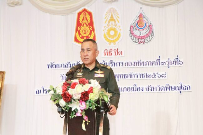 วันที่ 25 มิถุนายน 2568 เวลา 09.00 นาฬิกา ที่ โรงแรมท๊อปแลนด์ อำเภอเมือง จังหวัดพิษณุโลก พลโท กิตติพงษ์ แจ่มสุวรรณ แม่ทัพภาคที่ 3 เป็นประธานปิดการอบรมหลักสูตรพัฒนาสัมพันธ์ระดับผู้บริหารกองทัพภาคที่ 3 รุ่นที่ 6 โดยได้มอบเกียรติบัตร และเข็มที่ระลึกให้กับผู้ที่สำเร็จการอบรม ซึ่งผู้เข้ารับการอบรมประกอบด้วย ข้าราชการทหาร ตำรวจ จำนวน 20 นาย ข้าราชการพลเรือน พนักงานรัฐวิสาหกิจ พนักงานองค์กรของรัฐ จำนวน 17 รายและนักธุรกิจภาคเอกชน จำนวน 43 ราย ในพื้นที่ภาคเหนือ รวมจำนวนทั้งสิ้น 80 ราย