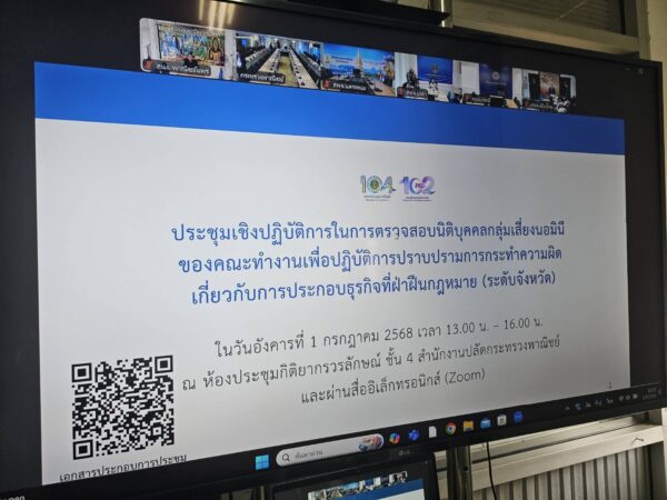 วันอังคารที่ 1 กรกฎาคม 2568 เวลา 13.00 น. ร้อยตรีจักรา ยอดมณี รองปลัดกระทรวงพาณิชย์ เป็นประธานประชุมเชิงปฏิบัติการในการตรวจสอบนิติบุคคลกลุ่มเสี่ยงนอมินีของคณะทำงาน เพื่อปฎิบัติการปราบปรามการกระทำความผิดเกี่ยวกับการประกอบธุรกิจที่ฝ่าฝืนกฎหมาย (ระดับจังหวัด) ซึ่งได้มีการชี้แจงแนวทางการดำเนิการของคณะทำงานฯ , แนวทางการปฏิบัติการตรวจสอบนิติบุคคลกลุ่มเสี่ยงนอมินี ,ขั้นตอนแนวทางการตรวจสอบนิติบุคคลกลุ่มเสี่ยงนอมินี โดยผู้อำนวยการกองธรรมาภิบาลธุรกิจ กรมพัฒนาธุรกิจการค้า และแนวทางการสืบสวนการกระทำที่เข้าข่ายความผิดนอมินี โดยผู้แทนจากกรมสืบสวนคดีพิเศษ (DSI) และผู้แทนจากกองบังคับการปราบปรามการกระทำความผิดเกี่ยวกับอาชญากรรมทางเศรษฐกิจ (บก.ปอศ.) ณ ห้องประชุมกิติยากรวรลักษ์ ชั้น 4 สำนักงานปลัดกระทรวงพาณิชย์ ตำบลบางกระสอ อำเภอเมืองนนทบุรี จังหวัดนนทบุรี