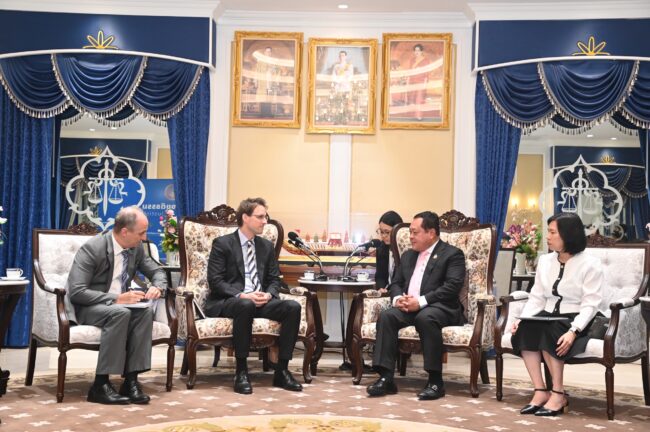 (15 กรกฎาคม 2568) ผู้สื่อข่าวรายงานจากกระทรวงยุติธรรม แจ้งวัฒนะ ว่า พันตำรวจเอก ทวี สอดส่อง รัฐมนตรีว่าการกระทรวงยุติธรรม ให้การต้อนรับ นายเบเนดิกต์ ฮอฟมันน์ (Mr. Benedikt Hofmann) รักษาการผู้แทนสำนักงานว่าด้วยยาเสพติดและอาชญากรรมแห่งสหประชาชาติ ประจำภูมิภาคเอเชียตะวันออกเฉียงใต้ และแปซิฟิก (United Nations Office on Drugs and Crime Regional Representative ad interim for Southeast Asia and the Pacific) พร้อมคณะ เพื่อแลกเปลี่ยนข้อคิดเห็นและหารือแนวทางความร่วมมือในประเด็นสำคัญเกี่ยวกับการแก้ไขปัญหายาเสพติดในภูมิภาค โดยมี นางยศวันต์ บริบูรณ์ธนา รองอธิบดีกรมคุมประพฤติ, ผู้ช่วยศาสตราจารย์ วรวีร์ ไวยวุฒิ รองผู้อำนวยการสถาบันนิติวิทยาศาสตร์ และนายรวิศ สอดส่อง หัวหน้าคณะทำงานรัฐมนตรีว่าการกระทรวงยุติธรรม พร้อมด้วยเจ้าหน้าที่จาก สำนักงานคณะกรรมการป้องกันและปราบปรามยาเสพติด และกองการต่างประเทศ สำนักงานปลัดกระทรวงยุติธรรม เข้าร่วม ณ ห้องรับรองกระทรวงยุติธรรม ชั้น 11