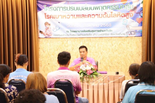 เมื่อวันพฤหัสบดี ที่ ๑๔ สิงหาคม ๒๕๖๘ โรงพยาบาลส่งเสริมสุขภาพตําบลวังลึกจัดกิจกรรมโครงการปรับเปลี่ยนพฤติกรรมโรคเบาหวานและความดันโลหิตสูง โดยมีนายสมพงษ์ รักแย้ม นายกนายกองค์การบริหารส่วนตำบลวังลึกเป็นประธานกล่าวเปิดโครงการฯ ณ ห้องประชุมโรงพยาบาลส่งเสริมสุขภาพตําบลวังลึก อำเภอศรีสำโรง จังหวัดสุโขทัย