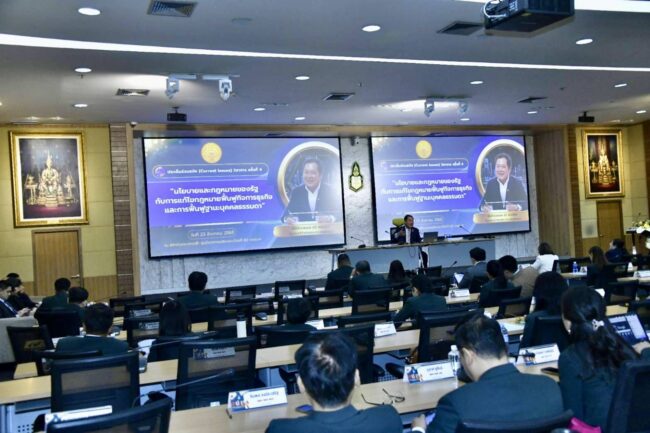 กรุงเทพฯ – วันนี้ (23 สิงหาคม 2568) พันตำรวจเอกทวี สอดส่อง รัฐมนตรีว่าการกระทรวงยุติธรรม และประธานคณะกรรมาธิการวิสามัญพิจารณาร่างพระราชบัญญัติล้มละลาย (ฉบับที่) พ.ศ. … ได้เข้าร่วมและกล่าวปาฐกถาพิเศษในการสัมมนาประเด็นร่วมสมัยวิชาการ ครั้งที่ 4 ในหัวข้อ “นโยบายและกฎหมายของรัฐกับการแก้ไขกฎหมายฟื้นฟูกิจการธุรกิจและการฟื้นฟูฐานะบุคคลธรรมดา” ของสถาบันพระปกเกล้า โดยย้ำถึงความสำคัญของการปฏิรูปกฎหมายล้มละลายครั้งใหญ่ เพื่อเป็นเครื่องมือในการแก้ไขวิกฤตหนี้สินของชาติ และเปิดโอกาสให้ผู้ประสบปัญหาทั้งภาคธุรกิจและประชาชนได้กลับมาเริ่มต้นใหม่อย่างมีศักดิ์ศรี