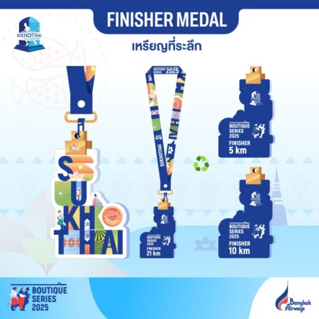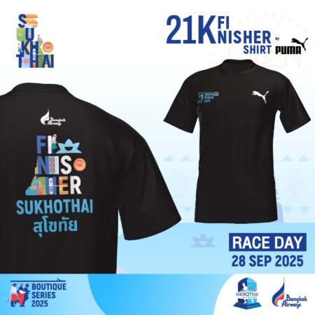 ไฮไลต์เสื้อวิ่งคอลเลกชัน Bangkok Airways Boutique Series 2025 ดีไซน์โดย Underhatdaddy ศิลปินอิสระที่มีสไตล์โดดเด่นไม่เหมือนใคร ถ่ายทอดเสน่ห์และอัตลักษณ์ของจังหวัดสุโขทัยผ่านลวดลายบนเสื้อวิ่ง เนื้อผ้าสวมใส่สบาย ระบายเหงื่อได้ดี ผลิตจากขวดน้ำพลาสติกรีไซเคิล ช่วยรักษาสิ่งแวดล้อม โดยเสื้อวิ่ง 1 ตัวใช้เส้นใยพลาสติกรีไซเคิลเทียบเท่าขวดน้ำ 20 ขวด และพลาดไม่ได้กับ เสื้อ Finisher สุดเอ็กซ์คลูซีฟจาก PUMA มอบเป็นรางวัลแห่งความสำเร็จสำหรับนักวิ่งที่พิชิต ฮาล์ฟมาราธอน 21 กิโลเมตร ภายใน 4 ชั่วโมง