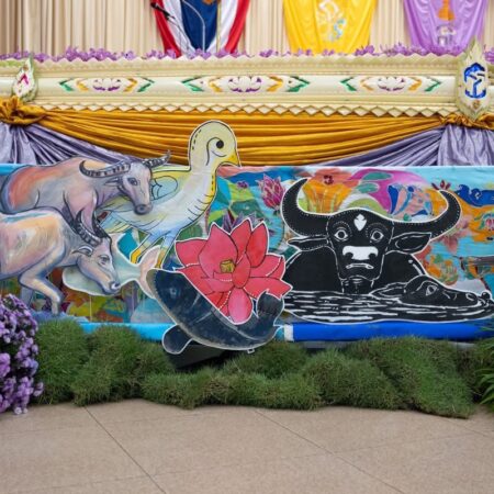 “การเลี้ยงควายปลักและระบบนิเวศในพื้นที่ชุ่มน้ำทะเลน้อย จังหวัดพัทลุง ซึ่งได้รับใบประกาศ จากเอฟเอโอ เป็นพื้นที่ มรดกทางการเกษตรโลก (GIAHS) แห่งแรกของประเทศไทย เนื่องจากมีความสอดคล้องกับหลักเกณฑ์ของระบบมรดกทางการเกษตร ซึ่งเป็นวิถีหรือระบบการทำการเกษตร ที่มีการสืบทอดกันมายาวนานจนถึงปัจจุบันจากรุ่นสู่รุ่นร่วม 200 กว่าปี มีอัตลักษณ์ที่โดดเด่นในการอยู่ร่วมกันระหว่างคน ควาย และสิ่งแวดล้อม ที่เป็นเอกลักษณ์เฉพาะถิ่น และ “พรุควนขี้เสี้ยน” ของทะเลน้อย ซึ่งได้รับการประกาศให้เป็นเขตพื้นที่ชุ่มน้ำโลก หรือ “แรมซาร์ ไซด์” (Ramsar Site) แห่งแรกในเมืองไทย อันเป็นพื้นที่ที่มีความหลากหลายทางชีวภาพมาก ทั้งระบบนิเวศ สัตว์ป่า สัตว์น้ำ พรรณพืช โดยเฉพาะนกน้ำนานาชนิดที่มีอยู่เป็นจำนวนมากมาออกแบบพระแท่นที่ประทับพระราชทานปริญญาบัตรอย่างวิจิตร งดงาม สะท้อนคุณค่าแห่งภูมิปัญญา ศิลปวัฒนธรรม วิถีชีวิต และระบบนิเวศที่สืบทอดจากอดีตสู่ปัจจุบัน” ผู้ช่วยศาสตราจารย์ ดร.ธัญญา พันธ์ฤทธิ์ดำ กล่าว