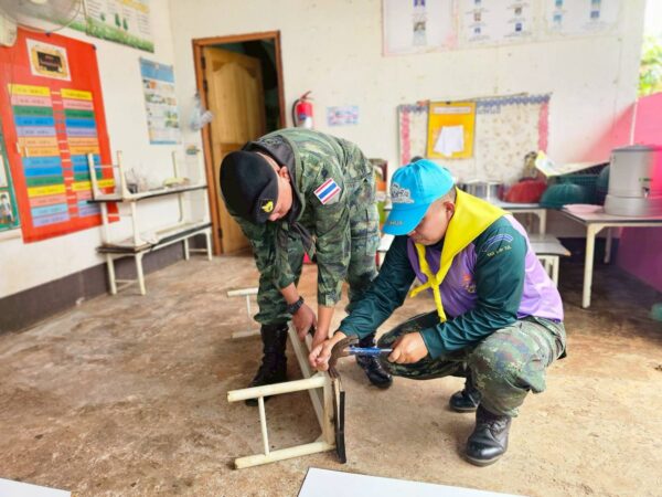เมื่อวันที่ 22 กันยายน 2568 กองบังคับการผาดง หน่วยเฉพาะกิจไชยานุภาพ จัดกำลังพลจิตอาสา ร่วมกับส่วนราชการ ต.เมืองนะ และ คณะครู ศูนย์พัฒนาเด็กเล็กบ้านเจียร์จันทร์ ร่วมกิจกรรม “จิตอาสาบำเพ็ญสาธารณประโยชน์” ซ่อมแซมโต๊ะรับประทานอาหาร และติดตั้งตาข่ายกรองแสงกันแดดบริเวณสนามเด็กเล่น ณ ศูนย์พัฒนาเด็กเล็กบ้านเจียร์จันทร์ ต.เมืองนะ อ.เชียงดาว จ.เชียงใหม่