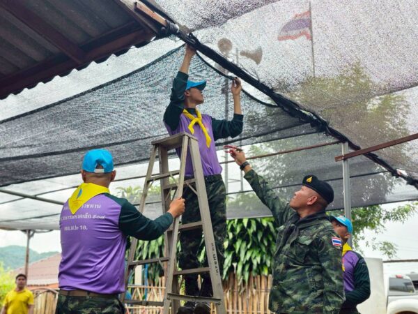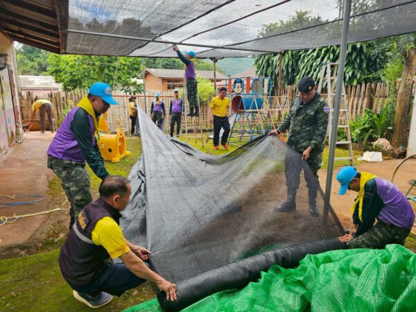 จิตอาสาพระราชทาน หน่วยเฉพาะกิจไชยานุภาพ จัดกิจกรรมจิตอาสาบำเพ็ญสาธารณประโยชน์ซ่อมแซมโต๊ะอาหาร ติดตั้งตาข่ายกรองแสงแดดสนามเด็กเล่น ศูนย์พัฒนาเด็กเล็กบ้านเจียร์จันทร์