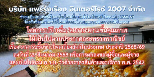 วันอังคารที่ 23 กันยายน 2568 เวลา 09.00 น. นายศุภสัณห์ ศิลป์ชูศรี พาณิชย์จังหวัดแพร่ เปิดเผยว่าตามที่หน่วยงานที่เกี่ยวข้อง ผู้ประกอบการฯ ตัวแทนเกษตรกร ตำบลสะเอียบ อำเภอสอง จังหวัดแพร่ ขอให้สำนักงานช่วยแก้ไขปัญหาบรรเทาความเดือดร้อนด้านราคาผลผลิตข้าวโพดเลี้ยงสัตว์ในพื้นที่ประสบปัญหาราคาตกต่ำกว่าปีที่ผ่านมา และสำนักงานฯ ได้ไปเจรจาการค้าเชื่อมโยงการซื้อขายผลผลิตข้าวโพดเลี้ยงสัตว์กับผู้ประกอบการรับซื้อพืชผลทางการเกษตร โดยได้ตกลงเจรจาการค้ากับผู้ประกอบการข้าวโพดเลี้ยงสัตว์จังหวัดแพร่ นายสมบูรณ์ รุ่งเรืองด้วยบุญ กรรมการผู้จัดการ บริษัทโรงสีแพร่รุ่งเรือง อินเตอร์ไรซ์ 2007 จำกัด เพื่อเข้าไปช่วยรับซื้อผลผลิตสินค้าเกษตรข้าวโพดเลี้ยงสัตว์จากเกษตรกรในพื้นที่ดังกล่าวในราคาผลผลิตเก็บเกี่ยวสด ความชื้น 30 % กิโลกรัมละ 6.10 บาท ราคาเพิ่ม/ลด ตามคุณภาพของผลผลิต ซึ่งสามารถเข้าไปรับซื้อผลผลิตได้ทันที หากมีการปรับปรุงซ่อมแซมจุดเส้นทางชำรุดเสร็จสิ้นแล้ว เพื่อสร้างกลไกการแข่งขันทางการที่เป็นธรรม นั้น