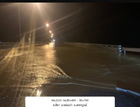 และในพื้นที่อำเภอหล่มเก่า จังหวัดเพชรบูรณ์ เมื่อเวลา 03.40 น. เกิดน้ำท่วมทำให้น้ำท่วมผิวทาง ระดับน้ำ: 35 เซ็นติเมตร ในทางหลวงหมายเลข 2216 ตอน โคกมน – กกกะทอน กม.: 80+465 ถึง กม.: 80+700 บริเวณสะพานแม่น้ำป่าสัก ตำบลตาดกลอย อำเภอหล่มเก่า จังหวัดเพชรบูรณ์ ทำให้การจราจรไม่สามารถใช้เส้นทางดังกล่าวได้ ขณะนี้แขวงทางหลวงเพชรบูรณ์ที่ 1 โดย หมวดทางหลวงตาดกลอย ได้ติดตั้งอุปกรณ์อำนวยความปลอดภัย เพื่อปิดการจราจร และจัดเจ้าหน้าที่อำนวยความสะดวกแก่ผู้ใช้ทาง