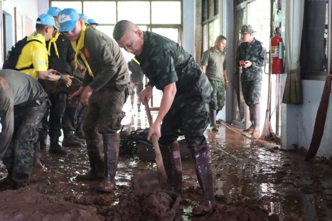 ต่อมา ผู้บัญชาการศูนย์บรรเทาสาธารณภัยมณฑลทหารบกที่ 35/ ผู้อำนวยการศูนย์อำนวยการจิตอาสาพระราชทานมณฑลทหารบกที่ 35 นำกำลังพลจิตอาสาภัยพิบัติ และ รด.จิตอาสาพระราชทาน เข้าร่วมช่วยเหลือประชาชนในระยะฟื้นฟู โดยได้ทำความสะอาดโรงเรียนบ้านท่าช้าง ตำบลบ่อทอง และโรงพยาบาลส่งเสริมสุขภาพตำบลผักขวง ตำบลผักขวง อำเภอทองแสนขัน จังหวัดอุตรดิตถ์ และเยี่ยมพื้นที่ประสบอุทกภัย ณ โรงพยาบาลตรอน อำเภอตรอน , ติดตามสถานการณ์น้ำ ในพื้นที่รับน้ำ และเยี่ยมศูนย์พักพิงให้กำลังใจผู้ประสบอุทกภัย อำเภอพิชัย จังหวัดอุตรดิตถ์ ที่ได้รับผลกระทบเหตุอุทกภัยจากอิทธิพลพายุบัวลอย เมื่อวันที่ 30 กันยายน 2568 ที่ผ่านมา
