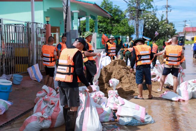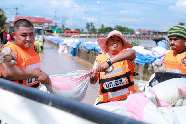 จากนั้น เจ้าหน้าที่กองอำนวยการรักษาความมั่นคงภายในจังหวัดสุโขทัย พร้อมด้วย ชุดปฏิบัติการบรรเทาสาธารณภัยและจิตอาสาภัยพิบัติ กองพันเสนารักษ์ที่ 23 กองบัญชาการช่วยรบที่ 3 ดำเนินการลำเลียงกระสอบทรายเพื่อทำแนวกั้นน้ำ ในพื้นที่ หมู่ที่ 9 ตำบลปากแคว อำเภอเมือง จังหวัดสุโขทัย