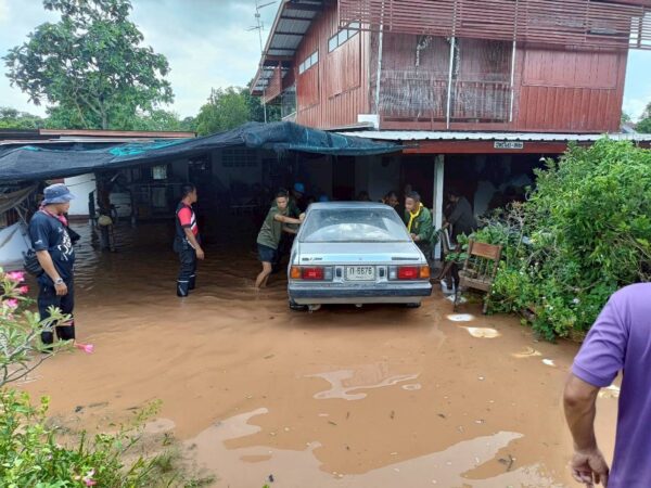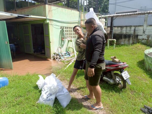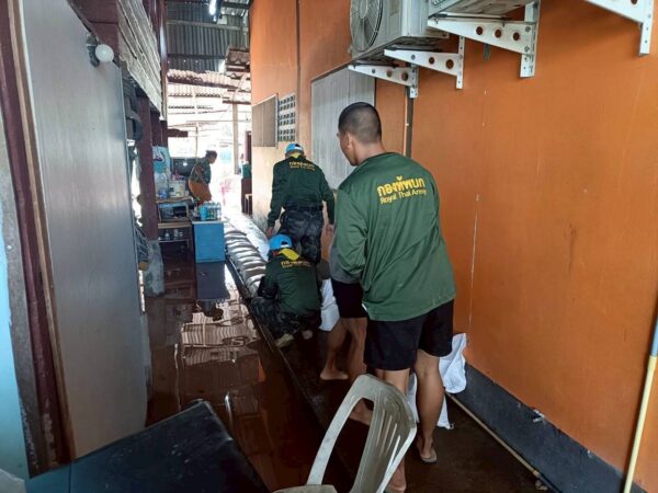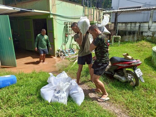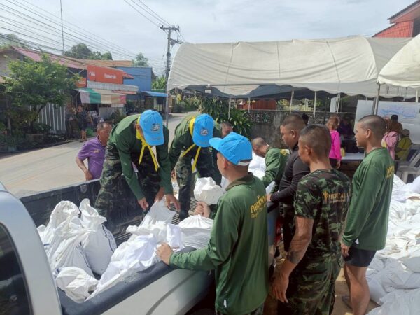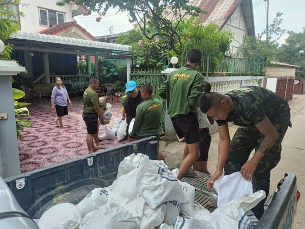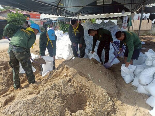 จิตอาสากองพันเสนารักษ์ที่ 4 ร่วมกับผู้นำชุมชน บรรจุกระสอบทรายแจกจ่ายประชาชน สร้างแนวป้องกันแม่น้ำน่านเอ่อล้นเข้าท่วมชุมชนในเมืองพิษณุโลก