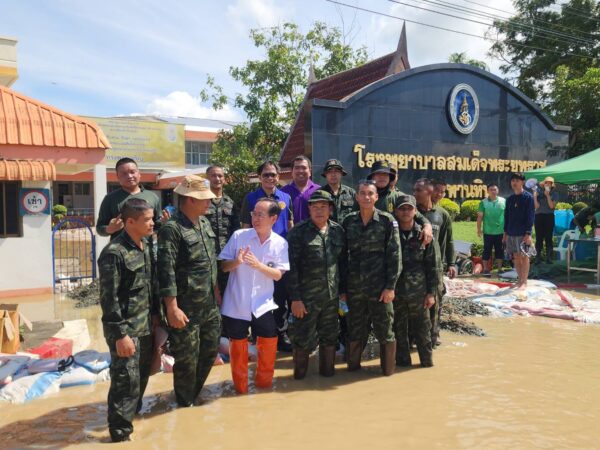 ล่าสุด นายกฤษณ์ สิทธิยศ ปลัดอาวุโสอำเภอตะพานหิน ประสานความร่วมมือกับ เจ้าหน้าที่ตำรวจสถานีตำรวจภูธรตะพานหิน, กำลังทหารชุดปฏิบัติการบรรเทาสาธารณภัยมณฑลทหารบกที่ 36 จิตอาสาภัยพิบัติจังหวัดพิจิตร เจ้าหน้าที่ของเทศบาลเมืองตะพานหิน รวมแล้วเกือบ 100 นาย ได้ช่วยกันวางแนวกระสอบทรายเพื่อป้องกันน้ำไม่ให้เข้าโรงพยาบาลได้ แต่ก็เป็นไปด้วยความยากลำบากเพราะมวลน้ำมีเป็นจำนวนมากและไหลมาอย่างต่อเนื่อง