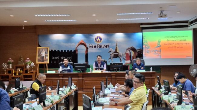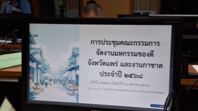 วันศุกร์ที่ 10 ตุลาคม 2568 เวลา 09.30 น. นายสมชัย เลิศประสิทธิพันธ์ ผู้ว่าราชการจังหวัดแพร่ เป็นประธานการประชุมคณะกรรมการดำเนินการจัดงานมหกรรมของดีจังหวัดแพร่ และงานกาชาด ประจำปี 2568 ครั้งที่ 4/2568 โดยมีนายคุณากร คชหิรัญ และนายชัยสิทธิ์ ชัยสัมฤทธิ์ผล รองผู้ว่าราชการจังหวัดแพร่ เข้าร่วมประชุมด้วย ซึ่งกำหนดจัดงานระหว่างวันที่ 1-10 ธันวาคม 2568 ณ สนามกีฬาองค์การบริหารส่วนจังหวัดแพร่ อำเภอเมืองแพร่ จังหวัดแพร่ โดยกองงาน 11 กอง ได้นำเสนอข้อมูลราย ละเอียดร่างกิจกรรม/ความคืบหน้าการจัดเตรียมงานฯลฯ เพื่อให้ที่ประชุมทราบและพิจารณา