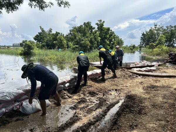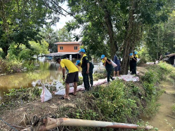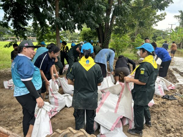 นักศึกษาวิชาทหารจิตอาสาภัยพิบัติมณฑลทหารบกที่ 39 ช่วยกันบรรจุกระสอบทราย สร้างผนังกั้นน้ำให้กับโรงเรียนวัดห้วงกระได อำเภอบางระกำ จังหวัดพิษณุโลก