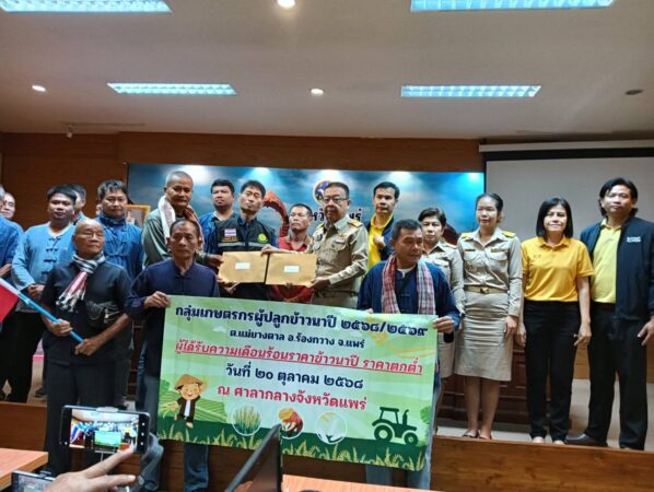 วันจันทร์ที่ 20 ตุลาคม 2568 เวลา 09.00 น. ได้มีผู้นำ/ตัวแทนกลุ่มเกษตรกรผู้ปลูกข้าว ตำบลแม่ยางตาล อำเภอร้องกวาง จังหวัดแพร่ มายื่นหนังสือขอให้จังหวัดช่วยเหลือเกษตรกรผู้ปลูกข้าว กรณี ราคาผลผลิตข้าวเปลือกราคาตกต่ำ ณ ห้องประชุมจดหมายเหตุ ชั้น 2 ศาลากลางจังหวัดแพร่ โดยนายสมชัย เลิศประสิทธิพันธ์ ผู้ว่าราชการจังหวัดแพร่ มอบหมายให้ นายชัยสิทธิ์ ชัยสัมฤทธิ์ผล รองผู้ว่าราชการจังหวัดแพร่ พร้อมส่วนราชการที่เกี่ยวข้องเป็นผู้รับมอบหนังสือดังกล่าว โดยเรียกร้องให้มีการช่วยเหลือกลุ่มเกษตรกรผู้ปลูกข้าวในพื้นที่ดังกล่าว เนื่องจากปัจจุบันราคาผลผลิตข้าวเปลือกตกต่ำ เหลือ 6.70 – 6.90 บาท/กก. เมื่อเทียบกับช่วงต้นฤดูการเก็บเกี่ยวเกี่ยวได้ราคา 8.50 – 10.50 บาท โดยขอให้ภาครัฐมีการประกันราคา พยุงราคา และช่วยเหลือเกษตรกรในด้านการลดต้นทุนการผลิต เช่น ลดราคาปุ๋ยที่มีราคาแพง อีกทั้งปัจจุบันมีการใช้เครื่องจักรเข้ามาช่วยในการผลิต เช่น โดรนพ่นยา ทำให้มีต้นทุนการผลิตสูงขึ้น ในขณะที่ราคาข้าวเปลือกตกต่ำ ตลอดจนให้หน่วยงานที่เกี่ยวข้อง มีการออกตรวจเครื่องชั่งตราชั่ง รถยนต์ หรือเครื่องวัดความชื้น ว่ามีความถูกต้องหรือไม่ ซึ่งสำนักงานสาขาชั่งตวงวัดเขต 1-3 แพร่ ได้ดำเนินการตรวจสอบแล้ว ไม่พบการกระทำความผิดดังกล่าวแต่อย่างใด