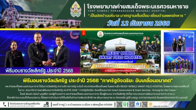 ทั้งนี้ จากผลงานการดำเนินงานของโรงพยาบาลค่ายสมเด็จพระนเรศวรมหาราช ในปีที่ผ่านมา โดยเป็นผลงานเชิงประจักษ์ จึงได้รับรางวัลเลิศรัฐ สาขาบริการภาครัฐ ระดับดี ประเภทขับเคลื่อนเห็นผล ในผลงานชื่อ Ready Mobile Smart Field Hospital โรงพยาบาลสนามเคลื่อนที่ ในงาน เสวนาวิชาการ และพิธีมอบรางวัล เลิศรัฐ ประจำปี 2568 ” ภาครัฐอัจฉริยะ ขับเคลื่อนอนาคต Smart Government & Smart Services : Driving for the Future ” ซึ่งพิจารณามอบให้กับหน่วยงาน ที่มีผลการดำเนินการที่เป็นเลิศในด้านการเพิ่มประสิทธิภาพ พัฒนาคุณภาพ ณ ห้องรอยัล จูบิลี่ บอลรูม อาคารชาเลนเจอร์ อิมแพคเมืองทองธานี จังหวัดนนทบุรี โดยมี พลตรี สมินท์ บุญลิขิต ผู้อำนวยการโรงพยาบาลค่ายสมเด็จพระนเรศวรมหาราช เป็นผู้แทนเข้ารับรางวัลฯ เพื่อเป็นเกียรติประวัติแก่หน่วยสืบไป
