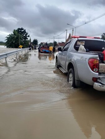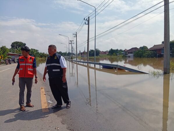 ในที่บริเวณถนน ทช อน. 3002 หมู่ที่ 6 ต.เกาะเทโพ ระดับน้ำเอ่อล้นตลิ่งถนนริมแม่น้ำเจ้าพระยา น้ำท่วมถนนประมาณ 40 – 45 ซม.