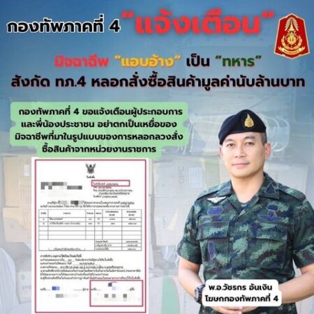 Read Moreกองทัพภาคที่ 4 แจง… กรณีมิจฉาชีพอ้างตัวเป็นทหารในสังกัด หลอกสั่งซื้อสินค้ามูลค่านับล้านบาท